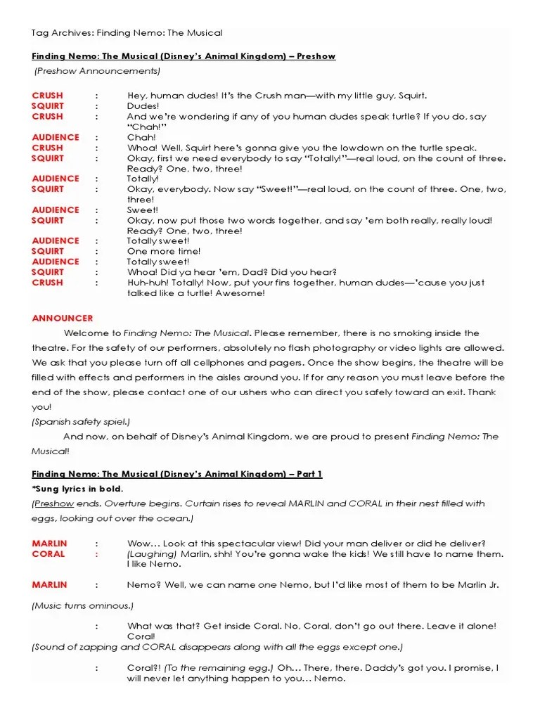 Finding Nemo Jr Script Printable - It takes an ensemble to make a show; Spark of creation studio (south san francisco, ca) in celebration of its licensing release, mti and disney. The musical revue fundraiser is back for an encore! A benefit event for disaster relief.